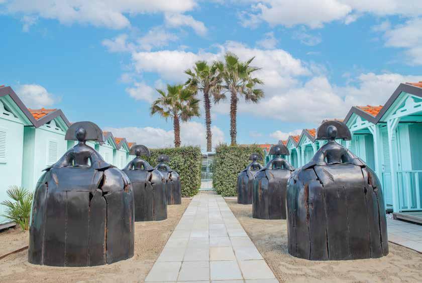 da questi capolavori Valdés estrae, geometrizzandola con le lacerazioni e imperfezioni della materia e dello scorrere dei secoli, una sorta di forma archetipa, che diventa emblema figurale di un suo lungo e libero cammino nella storia dell’arte. Il percorso creativo di Valdés diventa tangibile immergendosi nella meravigliosa pineta del Bagno Alpemare dove il visitatore può scoprire le dieci “Reina Mariana”: una versione in bronzo fuso del celebre ritratto dipinto da Velázquez, di Maria Anna d’Austria, iconografia reinterpretata così spesso da Manolo Valdés da essere diventata un simbolo identificativo della sua arte. La maestosa scultura “El Caballero”, anch’essa in bronzo, rappresenta l’emblema dell’omaggio a Velázquez e il principio indiscutibile secondo il quale i capolavori dell’arte sono connessi da un filo comune, in una perenne trasmissione in divenire di esperienze nel tempo. Da quasi sessant’anni, infatti, Manolo Valdés dà prova di come si possa produrre un’arte magnifica lavorando su illustri modelli del passato. La scultura monumentale di Manolo Valdés è percorsa da una forza e da una vitalità dirompente; con raffinata eleganza entra in connessione con