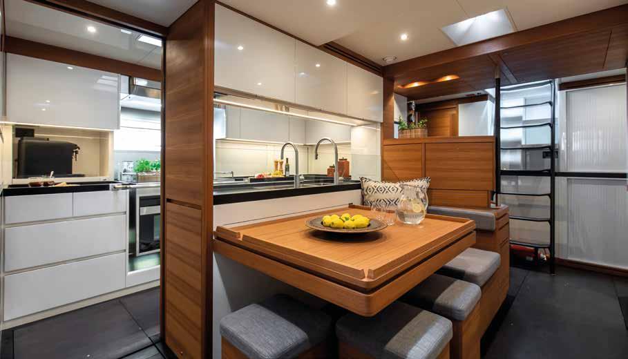 Below deck, there is a large and versatile cabin; thanks to the electrically folding table, it is possible to transform the space from a dining area into an elegant double cabin with natural daylight flooding in from the window hatches overhead.