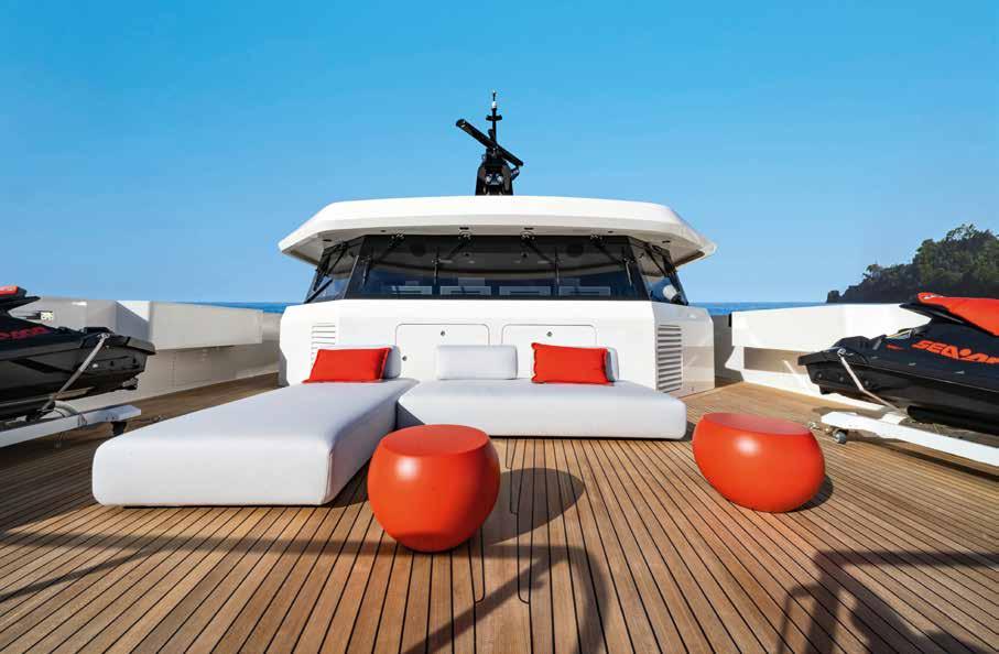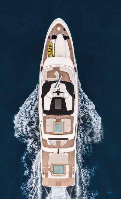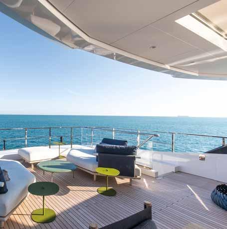 and launched in 2020. Then the pandemic upset everything, and owners now see their yacht as the safest island in the world”. Contact with the sea has become a top priority and there’s a greater awareness that this intimacy must be protected and preserved. In 2021 Benetti launched Oasis 40M, which has an extraordinary sea-level terrace that extends inside. Its exterior area can be doubled by folding out over the water surface taking the beach area’s total usable surface to 90 square metres with, of course, an infinity pool in the centre. “The guiding principle in developing the Oasis 40M centred around fostering an unforced symbiosis with nature. It was about designing a yacht that enabled guests to have an effortless, boundless connection with their surroundings while on board, leading to unique, unforgettable experiences,” explains Adrian Chisnell, RWD’s team principal.