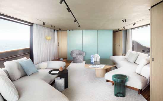 joining suite combinations that create versatile villa-lik residences with a distinctive Dolce Vita vibe. Each suite will offer floor-toceiling windows providing unobstructed natural light and access to expansive terrace decks not to mention 2.4m ceiling heights. The spectacular Funnel Suite, a reference to Christina O’s iconic funnel, offers its fortunate guests a massive 892 sqm of indoor and outdoor spaces spread over four levels, and also has a private tender access. Very James Bond indeed. The Four Seasons Yacht will, of course, offering its guests haute cuisine restaurants, lounges, bars, spas and a slew of other high-end amenities. www.tillbergdesign.com