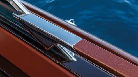 The deep rich mahogany livery is clear reference to Riva tradition too but has been given a contemporary allure thanks to a sophisticated and up-to-the minute metallic finish. Aboard the designers have reintroduced the now-legendary white and aquamarine colour combination, while steel is used to define details, profiles and finishing touches. In a constant dialogue between contemporary and traditional, the windscreen looks like it has been borrowed from the Aquariva but is actually absolutely up-tothe-minute – just like the waylights and the round portholes. The bridge’s vintage references are flanked by new generation digital instrumentation too. In fact, everything aboard has been meticulously designed to achieve the formidable mix of innovation, detailing and timeless styling that has made Riva such an iconic brand.