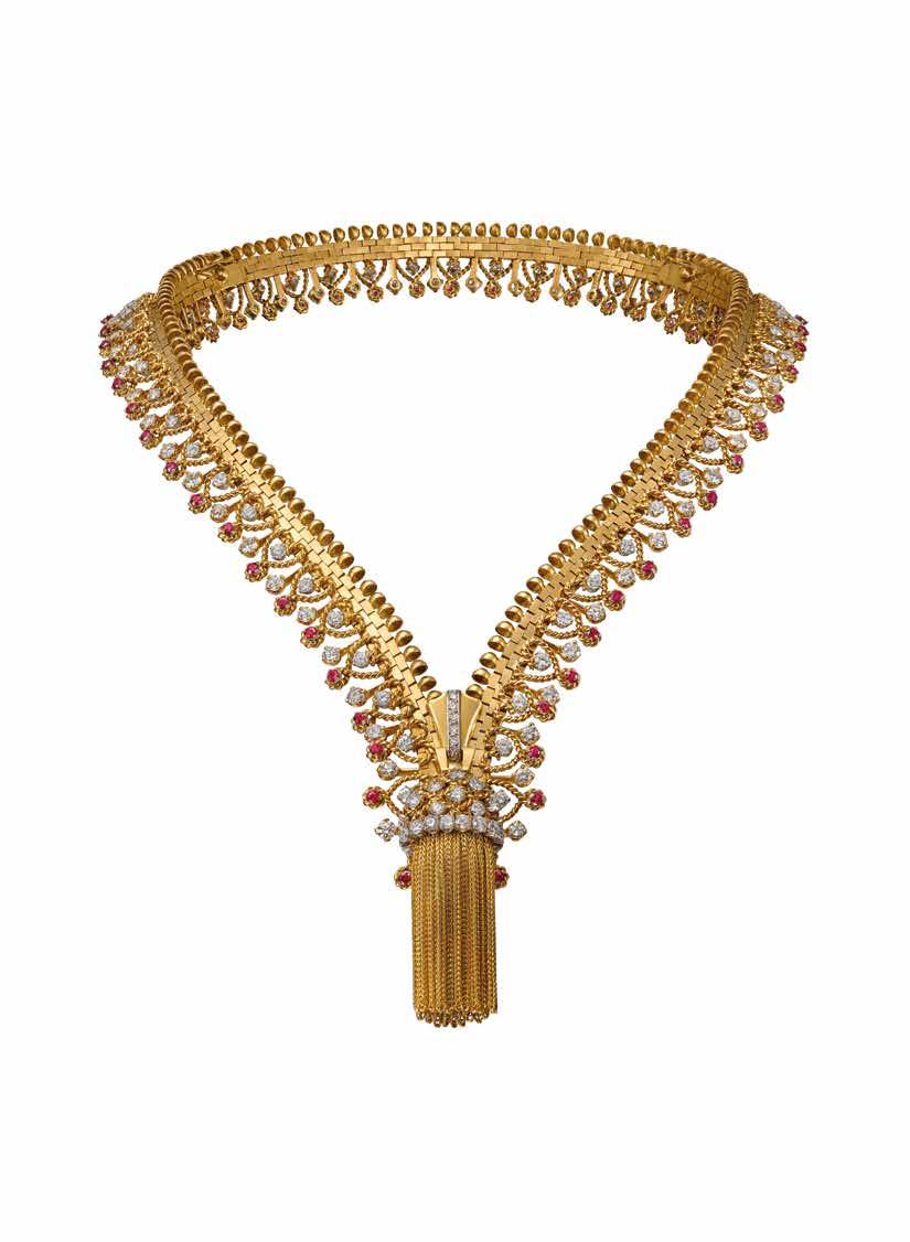 recorded in the sales ledger is a heart-shaped diamond. In the following years, many creations were made to celebrate the most famous love stories, from the Duke and Duchess of Windsor to Grace Kelly’s marriage to Prince Rainier of Monaco. The theme of love is still a constant in all the House’s collections, from engagement rings to wedding rings as well as watches and high-end jewelry pieces. Precious objects have always been expressions of love but they also reflect the zeitgeist. Over the years, Van Cleef & Arpels has played a major role in the jewelry world, developing an original style based on a subtle alchemy of creativity, innovation, and elegance. Nature, a classic source of inspiration for art and jewelry, has also provided the brand with an inexhaustible stylistic repertoire, and throughout its history, plants, flowers and animals have prompted an extraordinary profusion of colors, patterns, and materials, from precious gems to semi-precious stone and even organic materials. Van Cleef & Arpels became a key player after the opening of its New York headquarters, enjoying a period of great success in the 1950s, with the launch of the Tissu Serge collection and boutiques selling limited editions of jewelry at an accessible price to a wider, younger clientele. In the 1960s and 1970s, Van Cleef & Arpels focused on a floral motif with the Rose de Nöel coral brooches and earrings and Alhambra chains with gold and hard stone four-leaf clovers. The brand was also influenced by Eastern culture, which led to the creation of a series of multicolored necklaces inspired by the jewels worn by Maharajas.