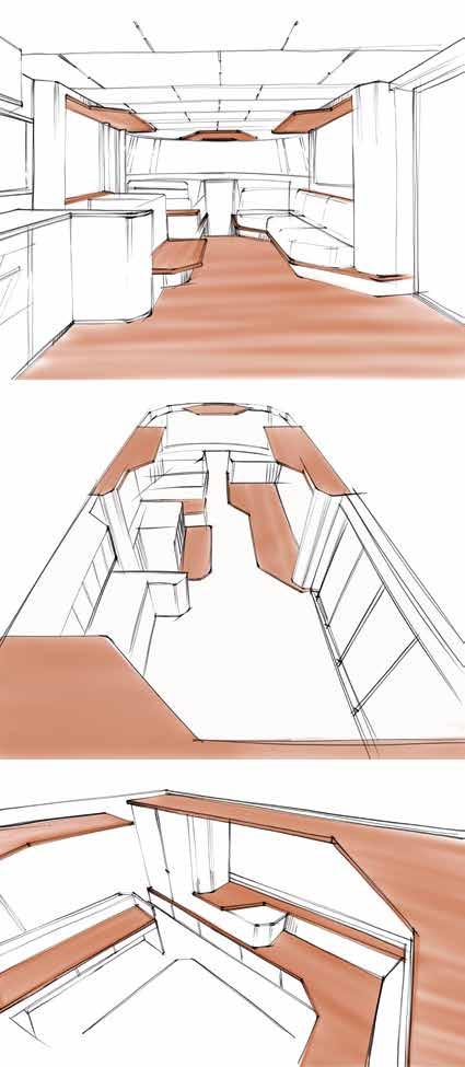 Thepower of pure purpose concept means that nothing aboard this 63m is just for show, purpose and beauty meld. The result is a wave-breaking bow chine, state-of-the-art shade devices, a spectacular observation deck and even a perforated swim platform that allows waves pass through it rather than fighting their action. LP Design’s brief was for a contemporary yet timelessly proportioned functional vessel with oodles of attitude. The full-displacement steel Explorer Yacht EXO – meaning outside – will deliver the endurance, capability and reliability, confidently tackling almost anything sea and climate throw at it. It also has a potential range of 5,000 nm. The layout allocates the perfect amount of space for guests, crew and owner as well as providing separate circulation paths. The final version of the styling seen here will, of course, be informed by the client’s wishes. The main saloon is airy, modern and intimate with side entrances avoiding the corridor effect and corner window arrays offering aft views. The rich materials in the Owner’s stateroom have a light neutral palette while its design centres around privacy, superb functionality, plentiful storage and effortless elegance. Lastly, hybrid dieselelectric technology delivers the perfect combination of power and silence. www.exoyacht.com