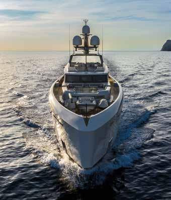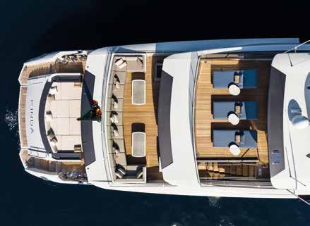 The distinctive feature of Kinda’s exterior design is the high, vertical bow that also extends the interior space. Top, the aerial view shows all the open-air social areas on Kinda’s aft section. The perimeter of the upper deck and fly deck (opposite page) are glass, emphasising the idea of transparency and lightness that underpinned the project