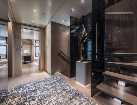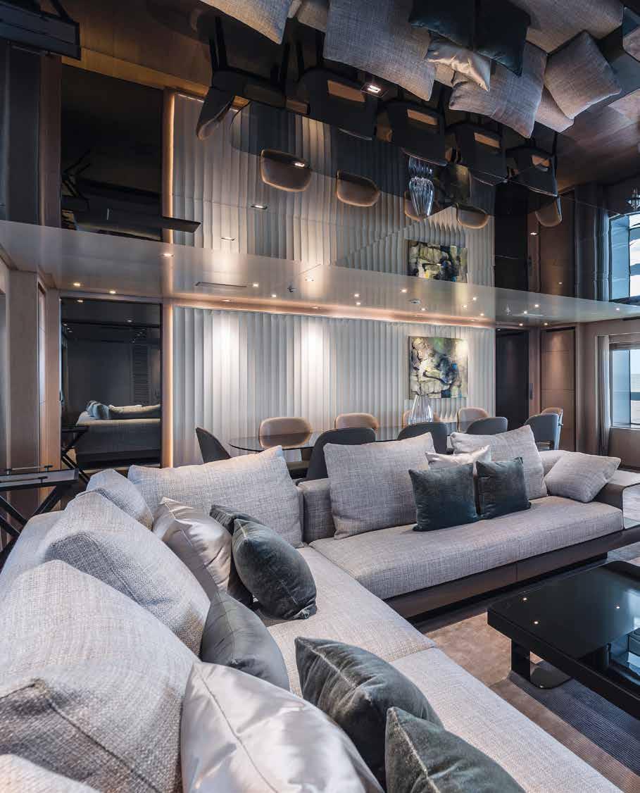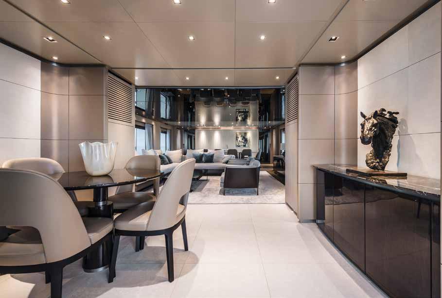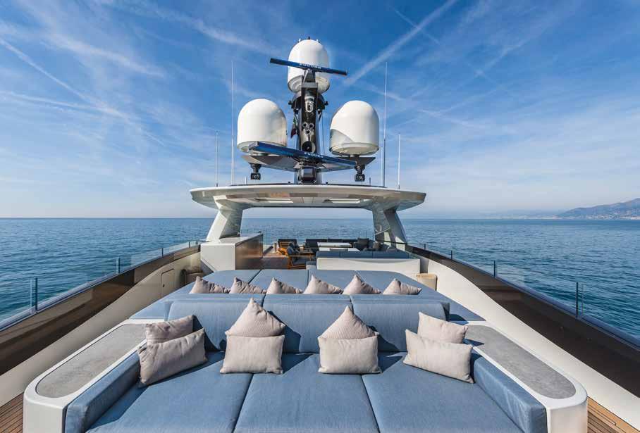 that offers the right balance between intimate spaces for enjoying peaceful moments and spaces in contact with the water, the sea and the marine environment, essential sources of harmony. The upper-deck living area is a wonderful example, a discreet, welcoming space where the windows, although not as expansive as those on the main deck, and glass balustrade provide a breath-taking that invites the gaze to lose itself in the immensity of the sea all around.