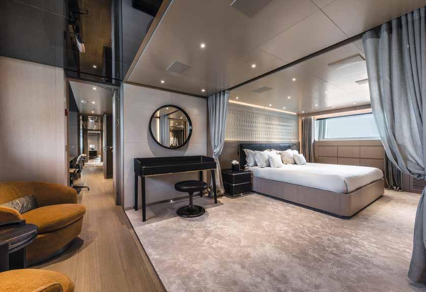 The sea’s presence fills the saloon through the large windows and lowered bulwarks, and is echoed by the soft, wavelike shapes and the furniture beneath the windows. The sofas, armchairs, poufs and coffee tables are all Italian made, selected from the Minotti collection, while the dining area seating is by Gallotti & Radice. In accordance with the owner’s wishes the layout of the forward section includes a VIP cabin and then the owner’s suite, a walk-through office area with desk looking out onto the sea. The owner asked for a small lounge and dressing table next to the sleeping area, with a bathroom forward with hammam integrated into the shower, and a walk-in wardrobe.