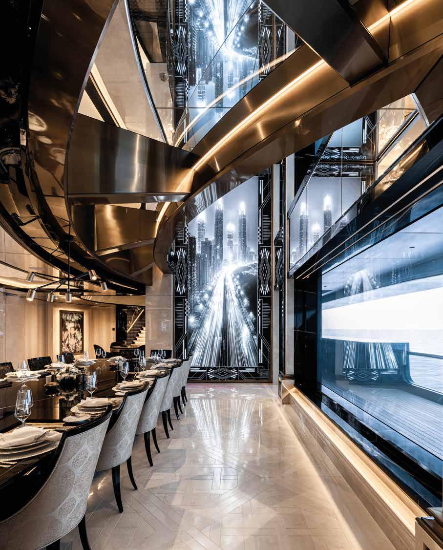 Kismet is the third yacht we have designed for this remarkable owner, a relationship that spans over 20 years. With each iteration Mr. K has challenged us to surpass our previous accomplishments, pushing the boundaries of innovation and creativity. Mr. K sought a yacht that was not just an extension of his previous vessels but something entirely new - avant-garde, yet timeless. Despite the constraints of the COVID-19 lockdown, which made in-person meetings impossible, we embraced this challenge. The design phase, from January to December 2020, took place entirely remotely. However, through perseverance and dedication, we were able to realise his and his family’s vision, creating a masterpiece that harmoniously blends history, innovation, and artistry. Every area is meticulously designed to evoke a sense of discovery and wonder - the transition between these contrasting environments is seamless, achieved with thoughtful design elements that connect spaces without jarring shifts in style or ambiance. The main grand staircase, adorned with a sixmetre Murano glass chandelier, reflects light onto the three side walls and ceiling in such a way that it transforms the space into an immersive, multi-dimensional experience. The architecture is very pure, with a contemporary black Corian stringer and a light stone step over. This black and white effect is needed to carry the very complex three-dimensional wall around it. Despite its grand scale, Kismet retains an intimate and cosy atmosphere, particularly in the Owner’s and guest suites, where haute couture elegance is evident in every detail. The challenge of integrating diverse design themes was resolved by blending modern touches that prevent pastiche and maintain cohesiveness throughout. Despite the challenges posed by the pandemic, Andy, Jason and I found inspiration in the serene, empty streets of Venice and the timeless beauty of Versailles. Kismet represents our greatest achievement yet, requiring us to redefine our approach and elevate our design vision to new heights.