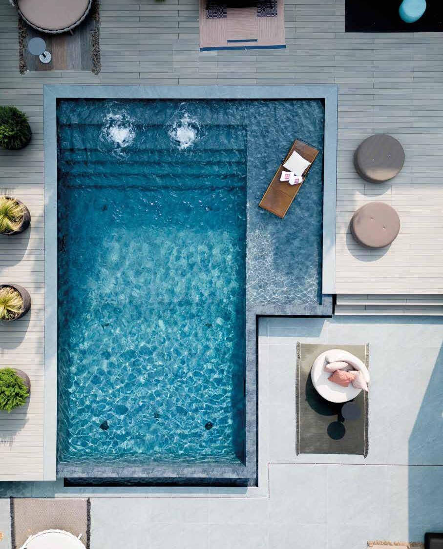 Edilfare Piscine creates minimal, linear designs but then gives itself free rein with functional features that provide high levels of comfort for those choosing to immerse themselves in the water,