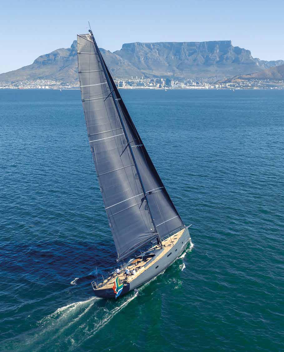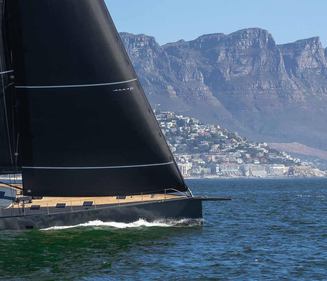 A spectacular shot of Nyumba against the backdrop of Table Mountain Cape Town, South Africa. The 29.24-metre yacht has carbon fibre hull, deck and bulwarks, twin rudders and a lifting keel (3.4m-5.5m). The main deck’s clean, essential lines are created by a low, sleek coachroof. Opening, the cockpit prepared for guests with cushions and tables