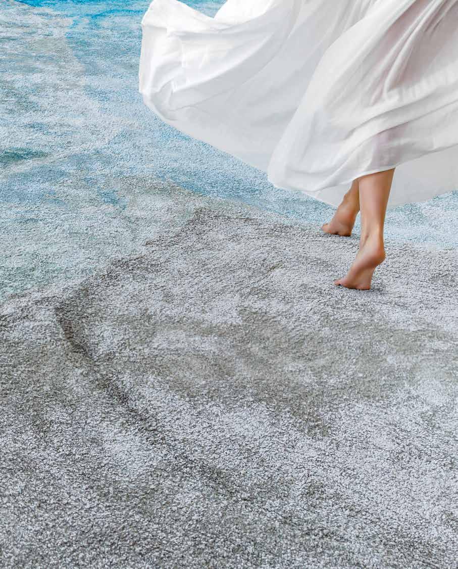 This page, above, a detail of the Mother of Pearl carpet from the new Ocean collection by Luxury Carpet Studio. Right, Sea model: colours and shades evoking a beach inviting barefoot walks. More than 200 colours were tested to achieve this effect, together with the use of artisanal techniques like embossing