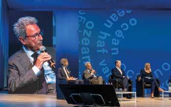 Below, bottom, Riccardo Bonadeo, President of the One Ocean Foundation, with Marco Tronchetti Provera, Together with the partners he intends making this an annual event so that the Blue Economy summit can open up a new way forward. Top, right, Giovanna Vitelli among the speakers.