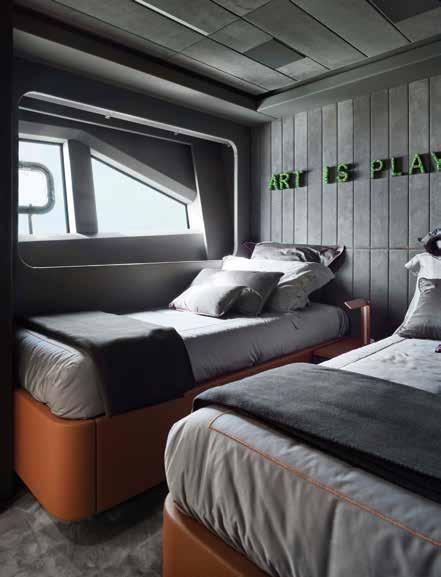 the Egeo table, made with a slab of dark glass with irregular edges, is surrounded by soft, embracing Blue Velvet chairs. A partition separates the saloon from the wheelhouse. Its mirrored surface reflects the sea, drawing it into the interior on all four sides of the saloon and enhancing the wonderful charm of life on the water. To the right of the partition the stairwell takes advantage of the light coming through the windshield and reflects it into the lower deck, the location of four guest cabins, two crew cabins and the galley. Grey is the dominant colour in the day area and on the lower deck, with copper notes and details. The four guest cabins host with art installations by Francesca Pasquali – each cabin features a slogan that has the impact of a statement and which, when all four are read together, reflect, as Marco Casamonti points out, the deepest meaning its creators sought to give the yacht - life is art, art is life, art is playing, playing is art. www.abyachts.com