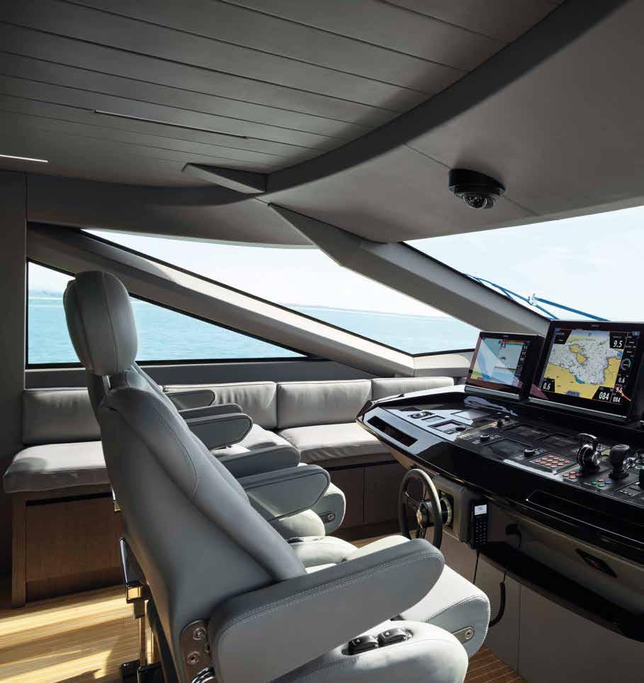 The main deck wheelhouse. The yacht, made in fibreglass composite and carbon fibre, is equipped with a powerful MJP hydrojet propulsion unit and three 2,000 hp MAN engines enabling a top speed of over 50 knots. As a result the yacht can sail from Portofino to Saint Tropez in a few hours, or from Miami to Cat Cays in the Bahamas in just one hour. The relatively shallow 1.3-metre draught makes it possible to access unexpected bays and beaches