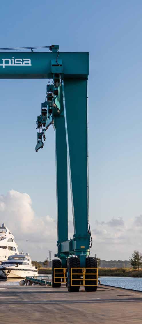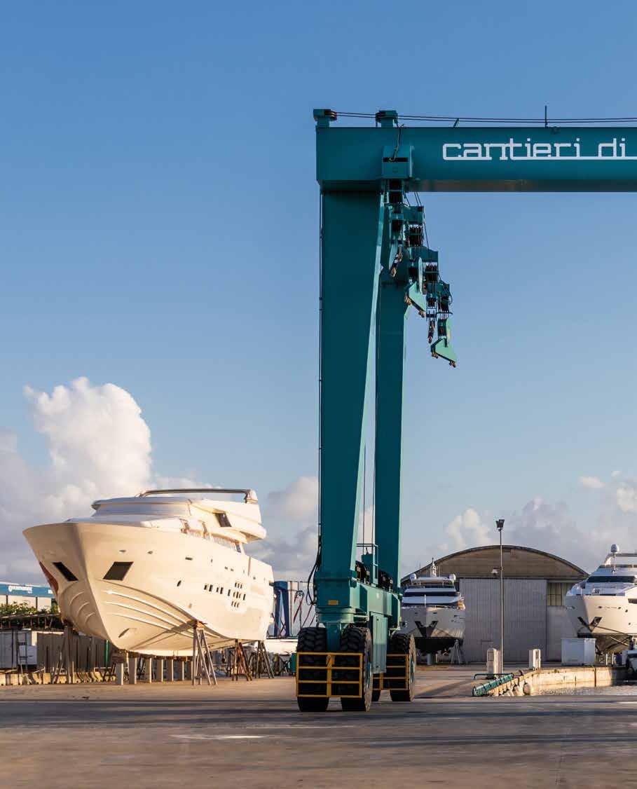 The Cantieri di Pisa travel lift. The brand was founded in 1945 in Limite sull’Arno, 30 kilometres from Florence, and in 1956 moved to its current location at Darsena Pisana, on the Canale dei Navicelli. It was acquired in 2021 by Enrico Gennasio, who initiated a new expansion project