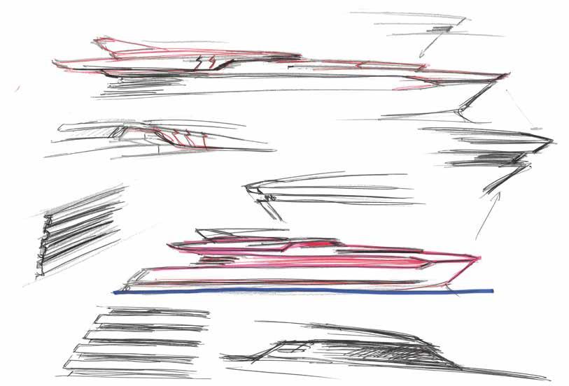 From left, Antonio Luxardo, chief designer for Cantieri di Pisa, and CEO Marco Massabò. Bottom, this page and opposite page, the basic lines of the new Akhir 44 in some hand-drawn sketches from the studio. The yard’s iconic yacht is given new life under the watchful eye of creative director Antonio Luxardo, who has retained the basic lines like the air intake with horizontal grille. Opposite page, top, renderings of the first models in the three new lines from Cantieri di Pisa: Saturno 56, Polaris 48 and Akhir 44