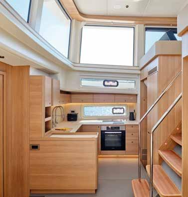 The opening windowed partitions (above) make it possible to create a large space comprising the dinette and cockpit. Double height for the kitchen area (below), which is drenched in natural light flooding in through the large coachroof windows. The design is clean and functional throughoutthis is even more evident when the yacht is under way (opposite page)