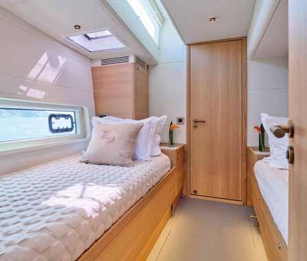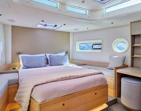 The interior colour palette is made up of light, neutral shades, with natural fabrics and bright, fresh spaces inviting relaxation. The central area of the lower deck is especially interesting - not all the lower deck is actually “below deck”. Coming down the stairs, guests land in an open-concept, double-deck height annexe that comprises galley and dining area. This space is very bright, exploiting the light streaming in through the coachroof windows.