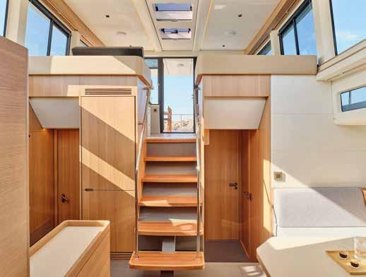 Natural materials, neutral colours and tactile finishes invite guests to relax in total comfort. Above, the helm console shares the dinette space. The three guest cabins on the lower deck (a four-cabin version is also in the works) with the full-beam owner’s cabin forward (left) and two cabins aft. The yacht has been optimised to sail at a relaxed speed of around 10-12 knots