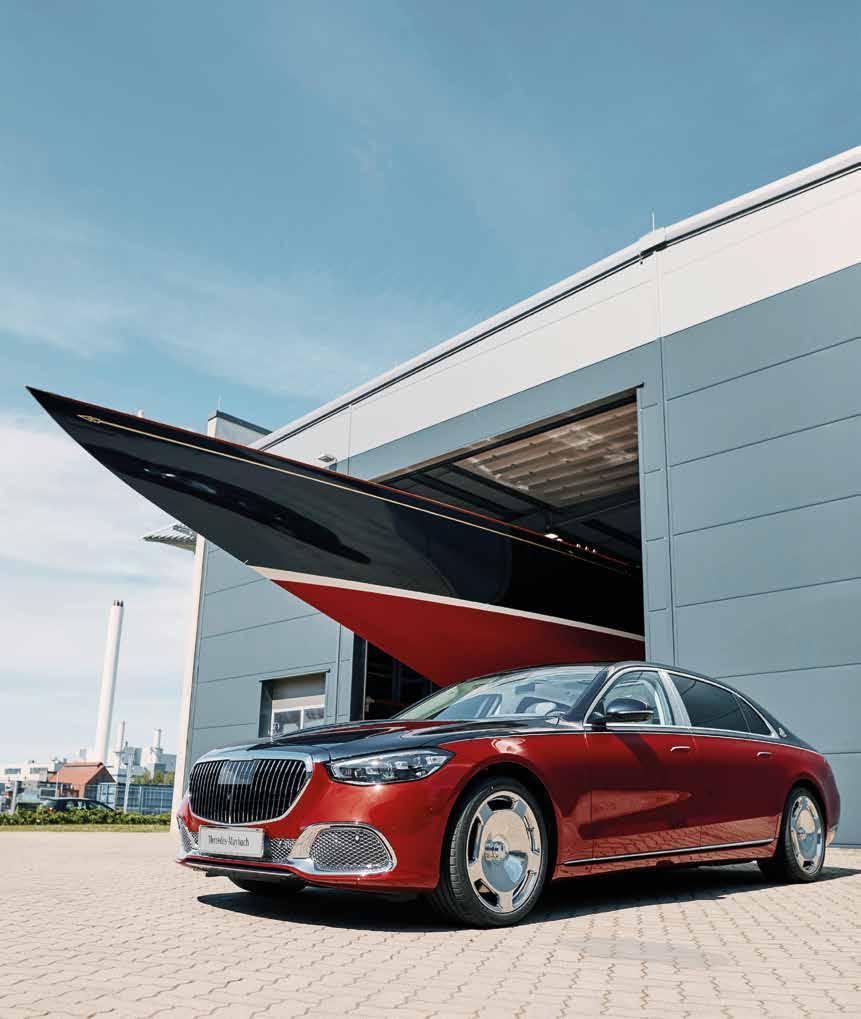 A shared expressive language is embodied by a Mercedes-Maybach S-Class 680, the pinnacle of four-wheeled travel from Stuttgart’s factory, and the “Twelves” Sphinx 12mR-class yacht (a category that reigned for decades in the America’s Cup). This yacht was launched on April 28, 1939 by the Abeking & Rasmussen shipyard and has an adventurous past. It returned to the limelight in 2005 when it was acquired at auction by a trio of sailors, enthusiasts, and philanthropists led by Oliver Berking.
