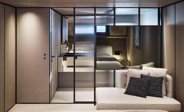 This page, on the third level a short corridor leads to the guest accommodation, with the owner’s cabin at the bow featuring a full-beam layout and en-suite bathroom.