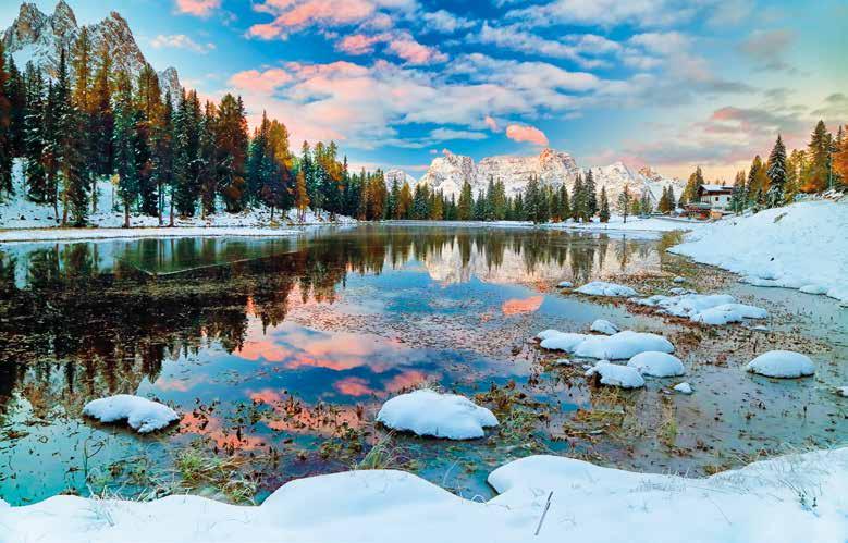 Cortina’s lakes are seasonless: beautiful in spring and summer, spectacular in autumn, and pure magic in winter when they’re frozen and blanketed with snow. To enjoy these fairytale scenes, you can go on snowshoe hikes or walks such as the one to Rifugio Croda da Lago, from which you can admire the frozen and snow-covered Lake Federa. A relaxing, easy trail that winds almost entirely through the woods leads to the Colbricon lakes, sitting at about 1,900 metres near Passo Rolle. Similarly, Lake Ajal can be reached from the Parù del Col parking area. If you’re holidaying near Cortina, dedicate a day to Lake Misurina—the largest natural lake in Cadore. In winter, it becomes even more captivating. Thanks to heavy snowfall and low temperatures, it turns into a prime destination for downhill and cross-country skiers. Non-skiers can walk across the frozen lake or sit and contemplate the Tre Cime and the Sorapiss group, which become a crown of white elegance. The lake turns into a vast snowy field, barely distinguishable from the surrounding landscape. Besides the classic lake loop, you can take a snowmobile to nearby Lake Antorno, or continue further up to the world-famous Tre Cime.