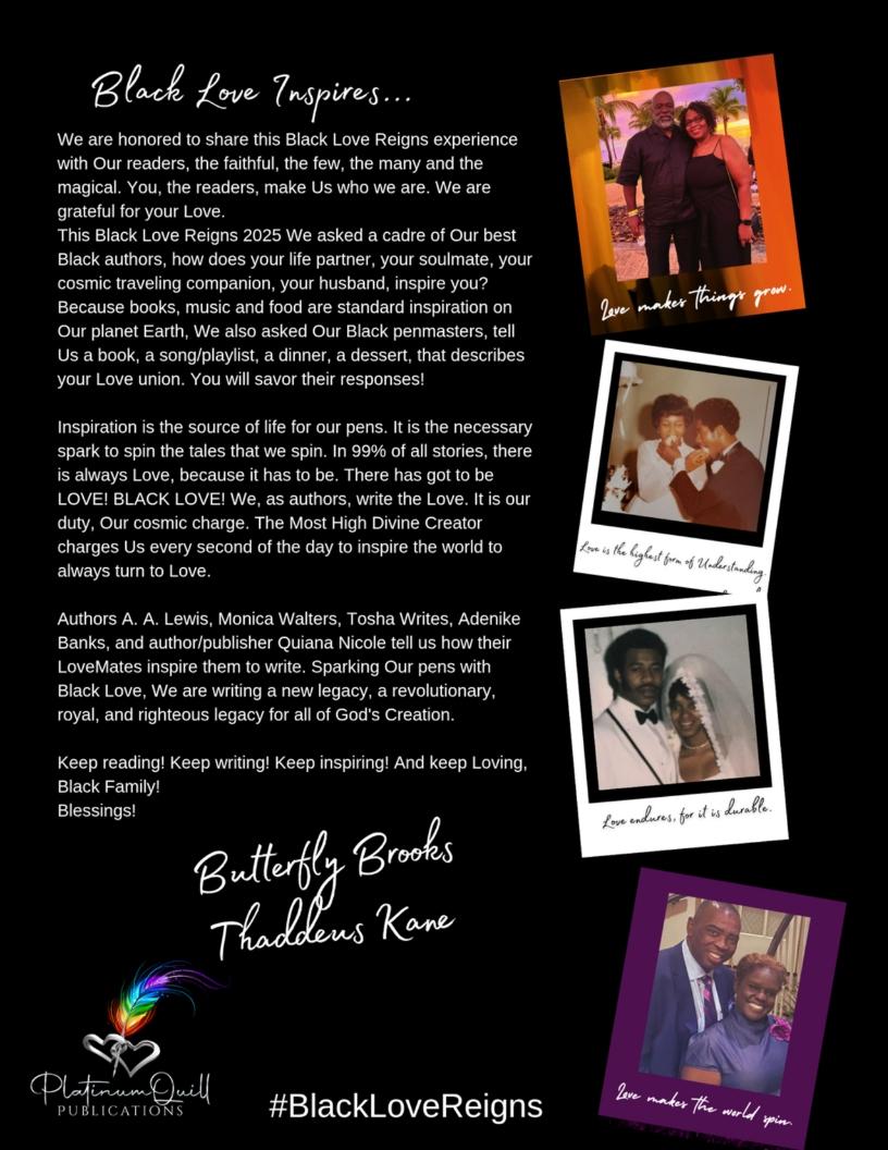 Platinum Quill Publications is the launchpad of Husband & Wife author Duet Butterfly Brooks & Thaddeus Kane. Black Love Reigns is an annual Free & Bargain Books Fest hosted by Platinum Quill. Black authors offer free and bargain books to readers around the world, books that have strong Black Love themes with Black characters. Black Love Reigns 2025 celebrates Black Love's inspirations featuring the industry best pensmiths.