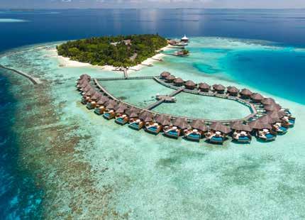 There are just 77 villas – 33 on the island and 44 suspended over the water, all with a private pool, you’ll enjoy views of the tropical gardens or the Indian Ocean from your private terrace. Plus, butler service is included as standard. There’s a choice of seven restaurants and bars, including modern Japanese Kaisekistyle cuisine at T-Pan, flavoursome Middle Eastern delights at Cargo and delicious hand-made pizzas at Crust & Craft. The overwater Iridium Spa has six treatment rooms, including two Ayurvedic suites and an invigorating hydrotherapy pool. There is also a salon, fitness and wellness centre and large outdoor infinity pool plus a separate kid’s pool, a PADI dive and watersports centre and children’s club that organises fun activities including yoga, painting and origami.