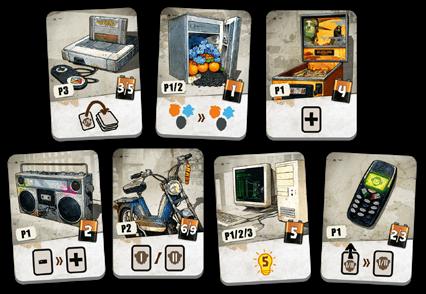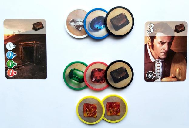 En deux tours de prise de ressources, on peut avoir de quoi acheter la carte de gauche plus deux jetons noirs, ce qui constitue déjà rapidement la moitié du coût de la carte de droite.