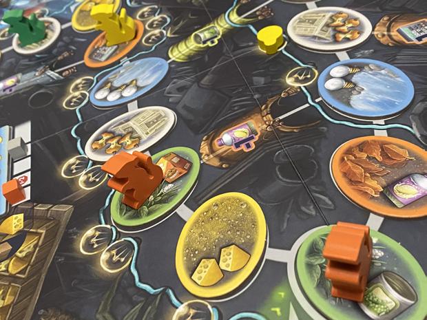 Il faut garder un œil sur la présence des couleurs, celles des cartes à acheter et des ressources qu’elles nécessitent. Quelle est la couleur la plus demandée par la grille ? Ces jetons seront les plus convoités et/ ou peuvent venir à manquer. Tout cela est utile pour repérer les chaînages possibles en vue d’économiser des ressources et planifier ses achats, peut-être en utilisant les synergies des triades évoquées plus haut