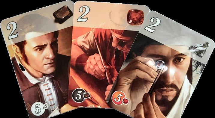 parfois aucun. Le bandeau supérieur affiche une couleur, celle de la pierre précieuse visible dans le coin supérieur droit et qui équivaut à un jeton permanent. Toutes les cartes en ont une parmi les cinq couleurs/pierres disponibles : blanc/diamant, noir/ onyx, rouge/rubis, bleu/saphir et vert/émeraude.