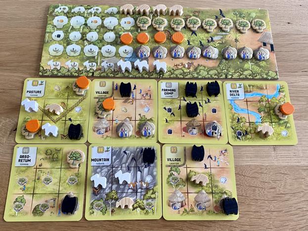 Il est parfois difficile d’attirer l’attention sur un jeu abstrait. Drones et Goélands use d’une thématique qui interpelle, opposant d’agressifs engins volants aux pas si pacifiques oiseaux des bords de mer pour le contrôle du littoral. Au centre de la table, sept jetons en acrylique représentent les avant-postes à conquérir, aux côtés marqués par chaque camp. Armés d’une même main de cartes, possédant des valeurs de 1 à 5, les duellistes aériens cherchent à prendre possession de tous les jetons pour gagner, par un jeu de majorité. À la simplicité des actions – jouer une carte de sa main –s’oppose la multiplicité des effets engendrés par le basculement de contrôle d’un avant-poste. Ceux-ci possèdent tous un pouvoir unique, influant sur les cartes déjà en jeu, provoquant des changements de contrôle en cascade. La maîtrise des combinaisons et du timing des prises de jetons sont primordiaux pour atteindre l’objectif qui demande beaucoup de