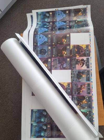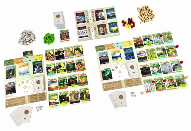 Elles se répartissent en 3 familles. Le tiers 1 est le plus étoffé avec 40 cartes, 8 par couleur, qui coûtent entre 3 et 5 jetons et ne rapportent aucun point sauf une, de valeur 1. Le tiers 2 ne comprend que 30 cartes, 6 par couleur, qui coûtent entre 5 et 8 jetons pour apporter entre 1 et 3 points de victoire. Le tiers 3 se compose de 20 cartes, 4 par couleur, qui appellent entre 7 et 14 jetons à l’achat pour rapporter entre 3 et 5 points de victoire. Elles forment une grille au centre de la table qui propose douze cartes, quatre par famille, plus une pioche face cachée pour chacune d’elles qui viendra compléter les lignes après un achat.