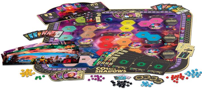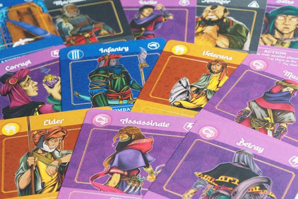 Notons aussi une résolution des conflits qui s’affranchit du hasard des dés et dont les modificateurs s’acquièrent grâce à des cartes proposées dans une rivière. Cela permet d’anticiper les manœuvres d’un adversaire, tout en maintenant une certaine incertitude quant à l’issue d’un combat. Ce qui est d’autant plus agréable que les agressions militaires sont plutôt rares et cruciales. Les cartes permettent aussi un judicieux équilibrage. Le paquet se divise en quatre domaines, alignés sur quatre des cinq factions. L’espionnage, la corruption et
