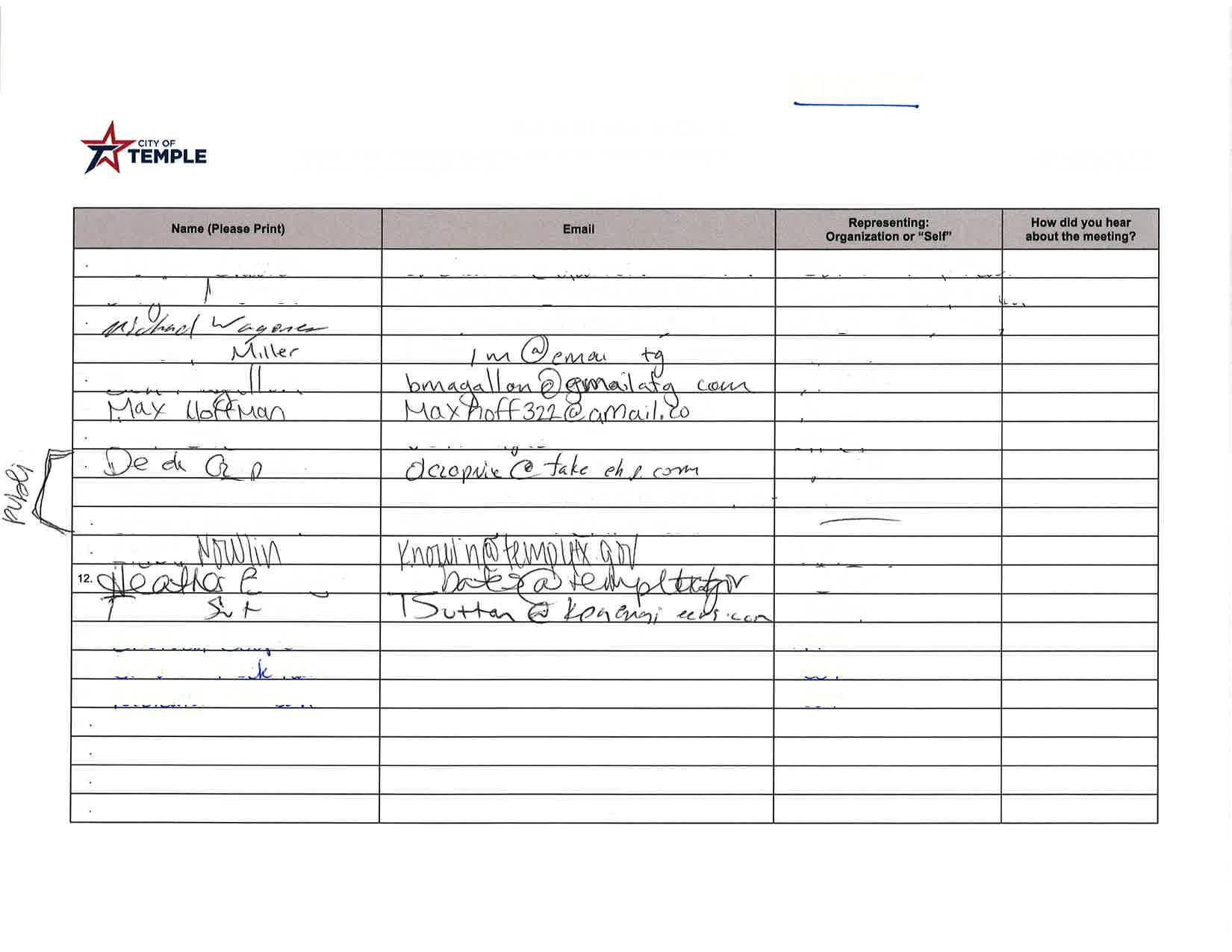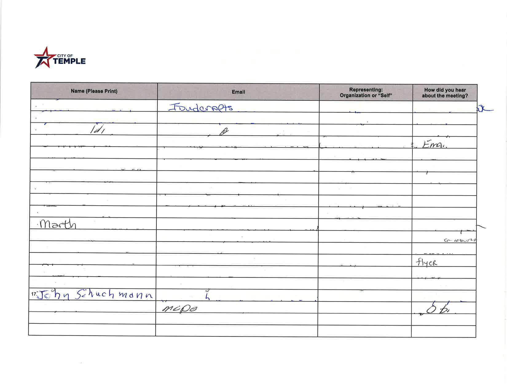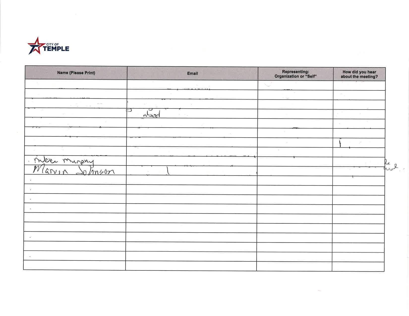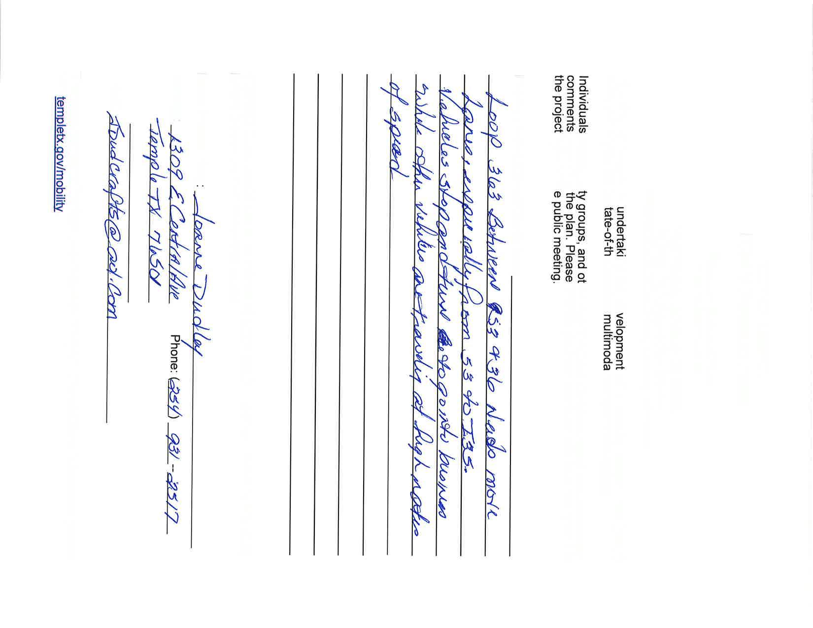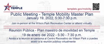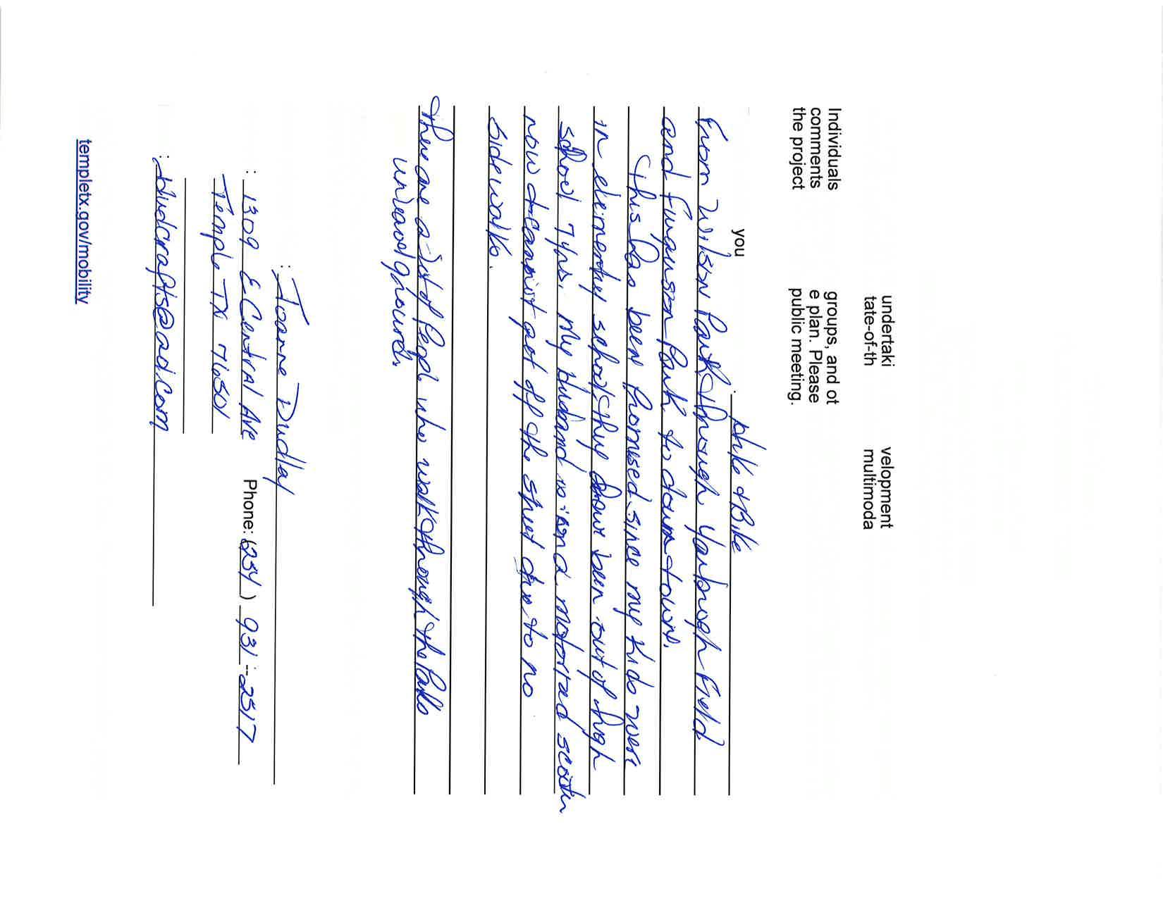 Date Did you attend the in-person meeting on January 19? Where in the city do you live? (zip code) Where do you work? (zip code) How long is your commute to work or school? How often do you use hike/bike trails in Temple? How often do you use public transit in Temple? TRAFFIC: Where have you seen a "near-miss" accident? TRAFFIC: Are there intersections or roadways that need improvements? TRANSIT: What would make public transit a viable or desirable option for you? TRANSIT: Where would you like public transit to take you in Temple? (Be specific)