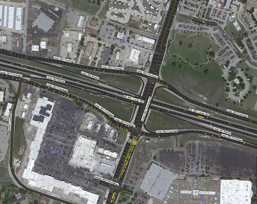 TransModeler simulation software was used for traffic analysis of the 2045 future conditions. TransModeler analysis was performed for AM and PM peak hour time periods, as peak hour traffic represents the most critical period for traffic operations and has the highest roadway capacity requirements. The TransModeler simulation was updated based on the output from the regional travel demand model and was used to model the No Build condition to serve as a baseline for which to evaluate the signal optimization and intersection improvements. The TransModeler No Build condition included present day conditions and signal timings provided by the City of Temple where available.