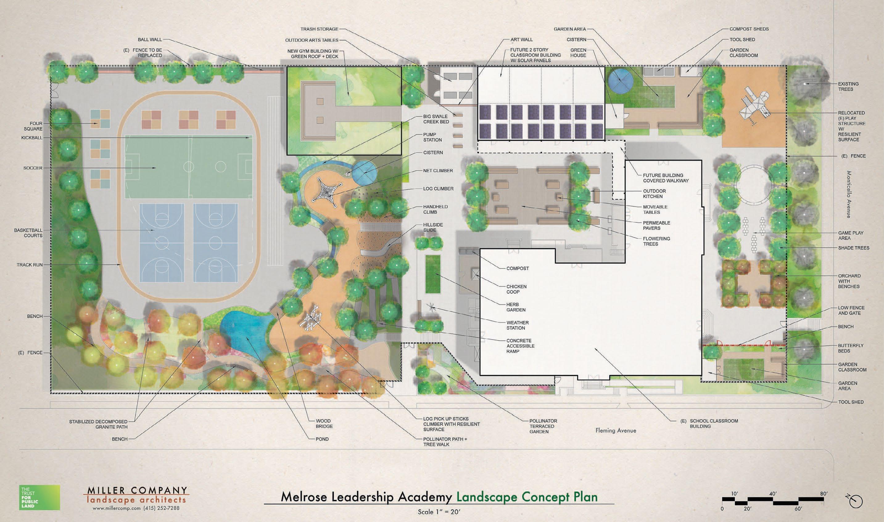 This rendering was created as part of the Trust for Public Land’s work to redesign schoolyards in the Oakland Unified School District for learning, health and climate resilience. The design highlights opportunities to include all eight design principles. Though strategic planning, Green Schoolyards can be phased as a multiyear project as budget allows.