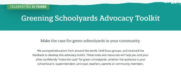 The “Green Schoolyards Advocacy Toolkit” can help you and your allies confidently “make the case” for green schoolyards, whether the audience is your school board, superintendent, principal, teachers, parents or community members. It includes a slide deck, handouts, case studies, and more! https://www.childrenandnature.org/resources/green-schoolyardsadvocacy-toolkit/