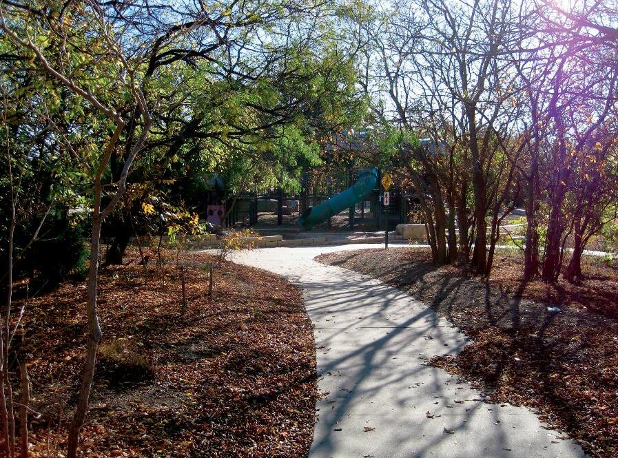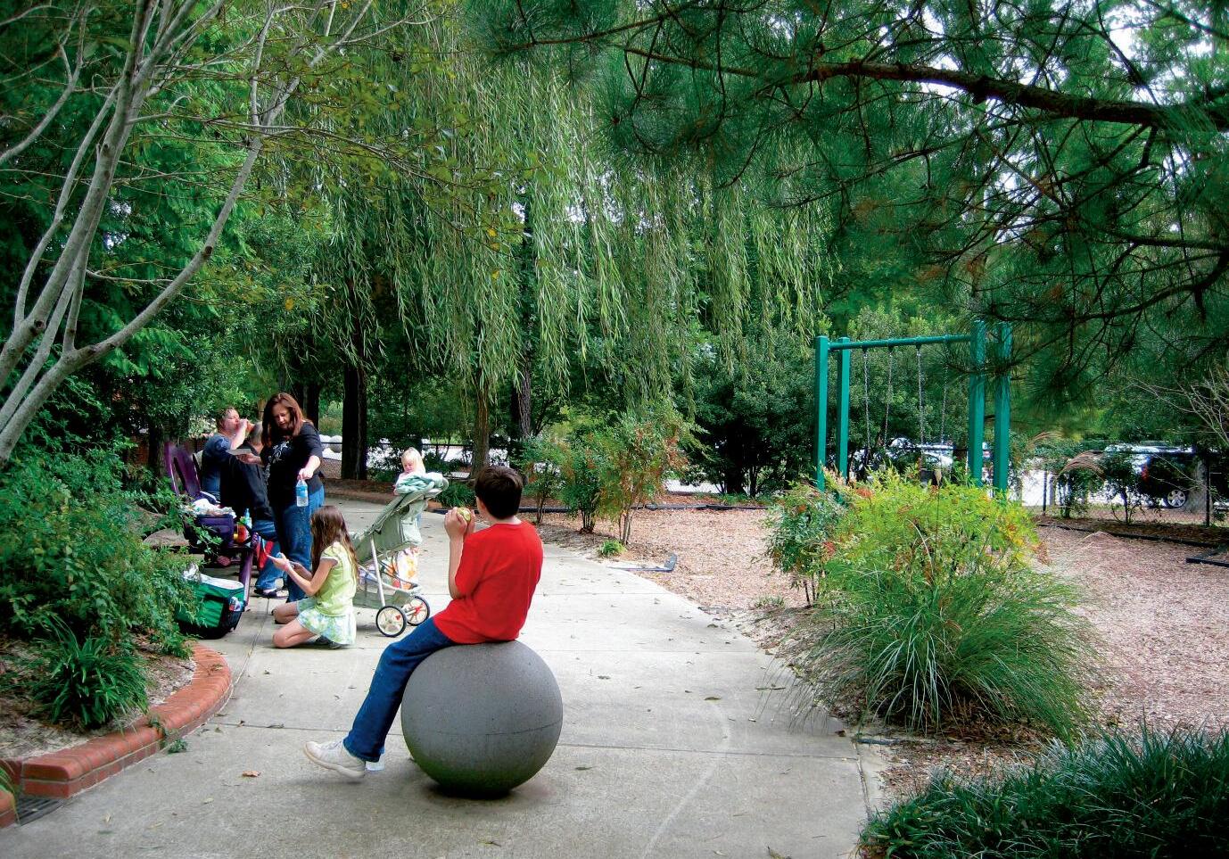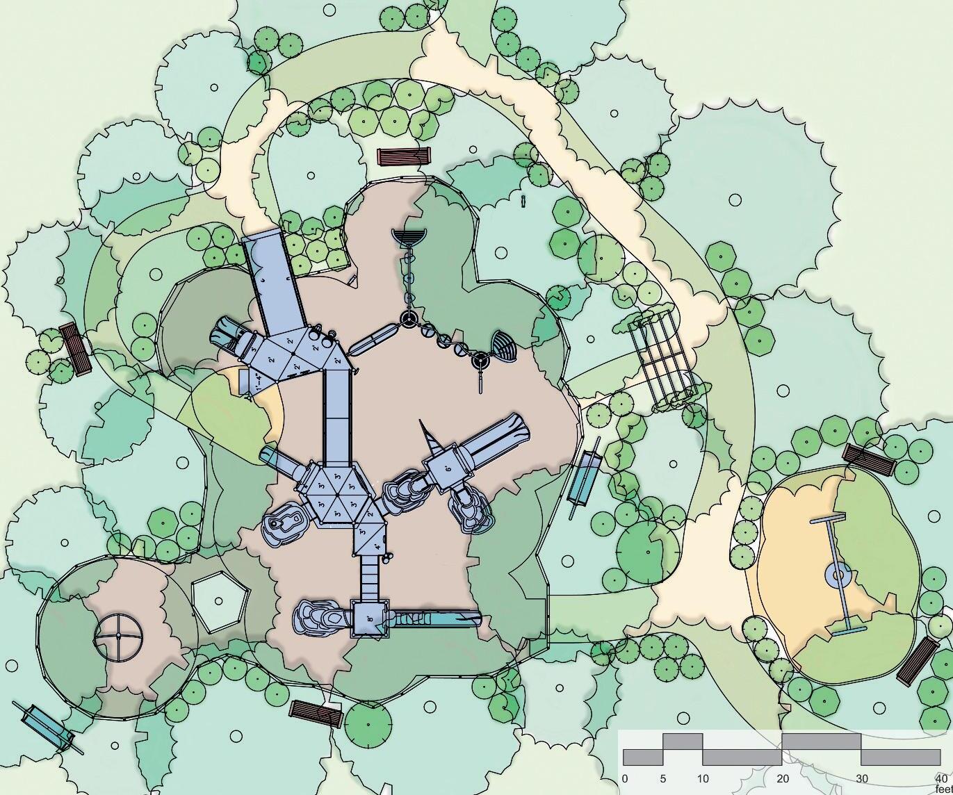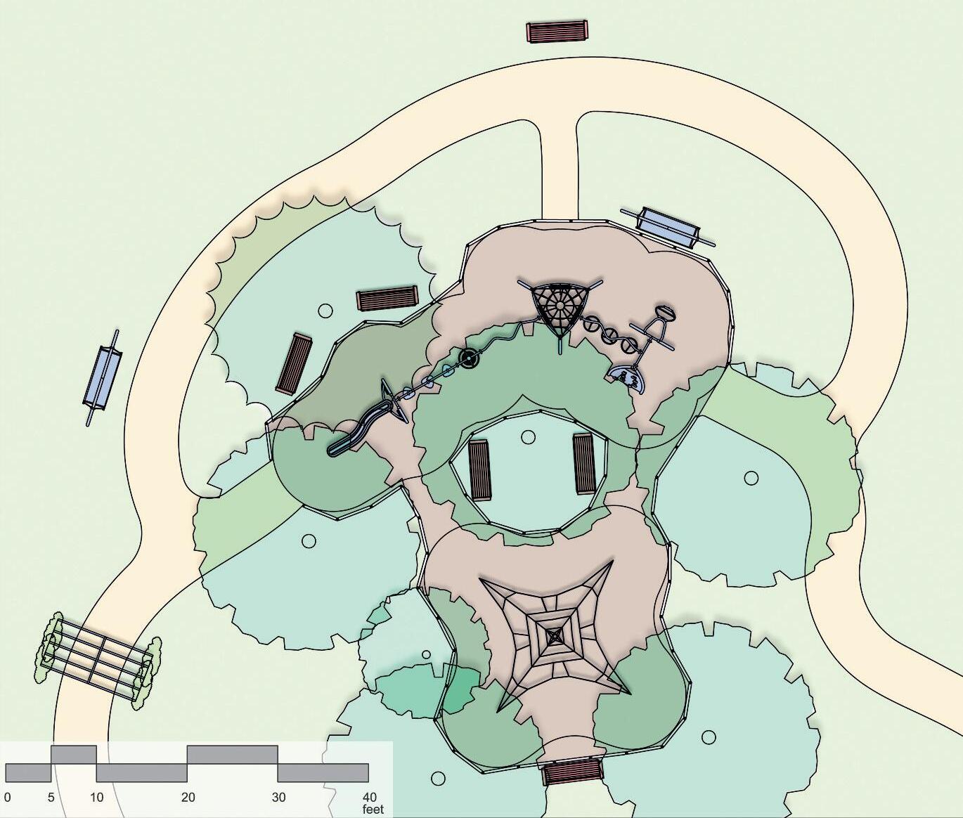 • Curvy pathways weaving around and connecting equipment and natural components provide attractive, accessible, active settings for children, and social strolling by adults.