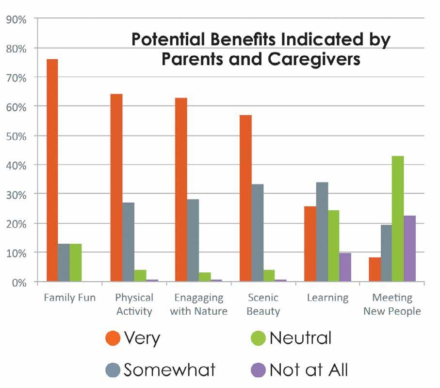 • Benefits: “Family Fun” was the most important benefit of pathways perceived by parents, closely followed by physical activity, engagement with nature, and scenic beauty.