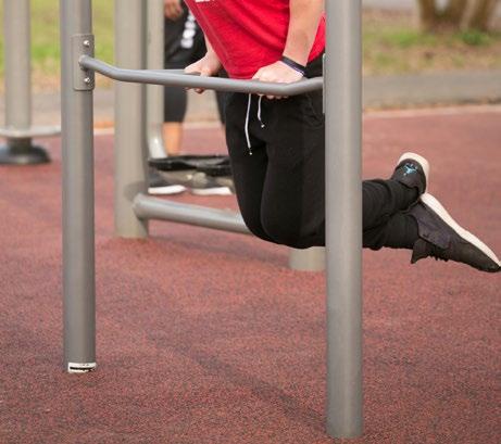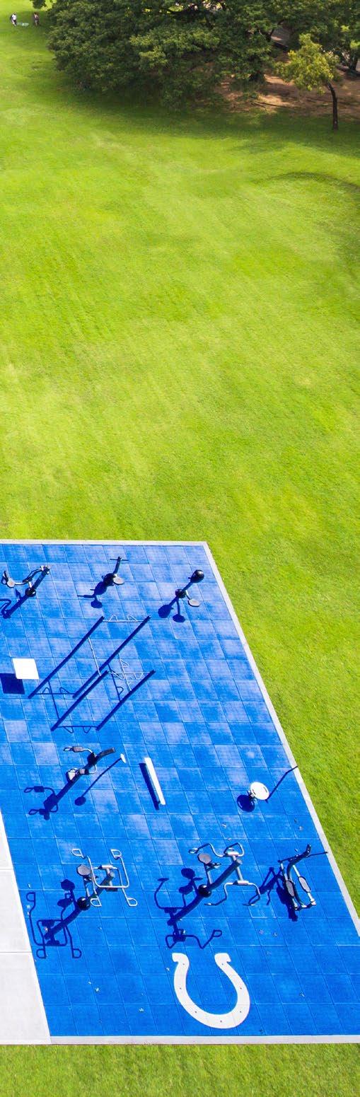 Along trails or in designated areas, outdoor adult fitness spaces can enhance the overall design of the environment. These areas can be found along trails, in clusters, or alongside a playground area, rehabilitation facility, or university. Including fitness opportunities in the area will allow for the users to promote physical activity, improve mental well-being, and help promote health and wellness. Surfacing will be an important part of these spaces as protective surfacing is required for some equipment. In addition, designs can be incorporated into the surfacing to further extend exercise opportunities. Some examples include dot drills, long jump markers, sprint measurements, and agility ladders, all which can be added to many types of surface by using contrasting colors.
