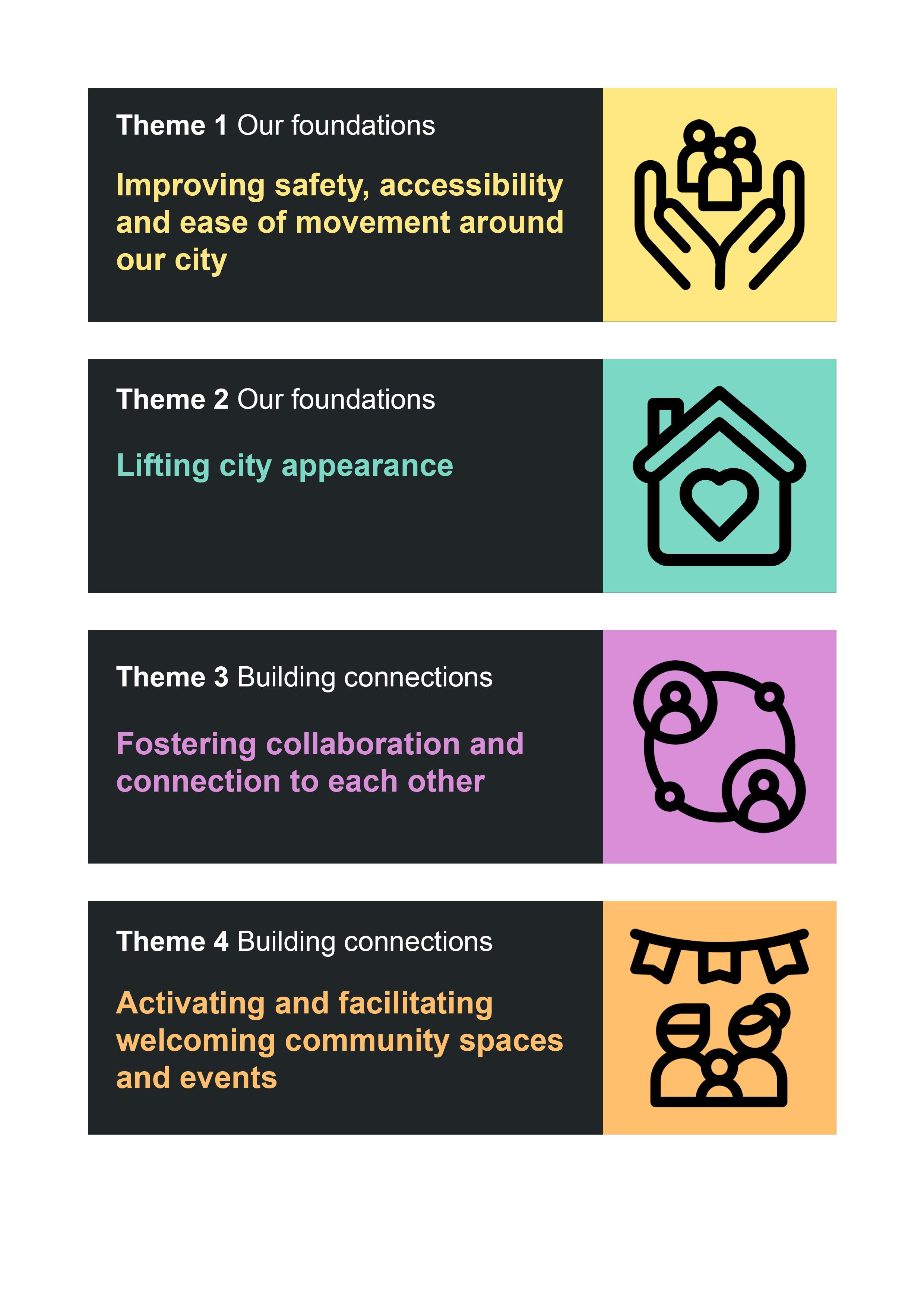 From page 15, each theme is described in more detail to explain how Council will work with the community to address them over the coming four years