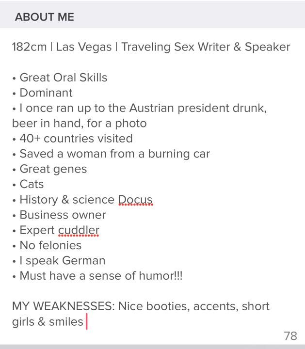 Don’t copy and paste this bio! Just because it works in this one case, doesn’t mean that women will believe it’s also reflective of you. Instead, focus on understanding each of the elements of his bio, and adjust to reflect your own personality.