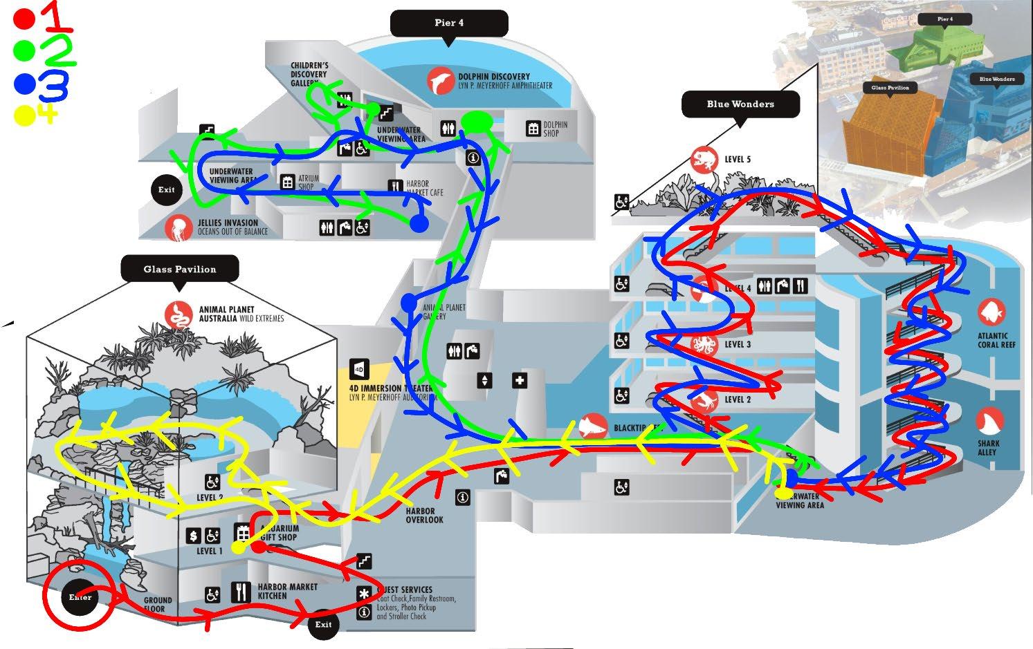 This is the route we took through the aquarium. The red line is where we entered and went first, the green line is where we went second, the blue line is where we went third, and the yellow line is where we went last.