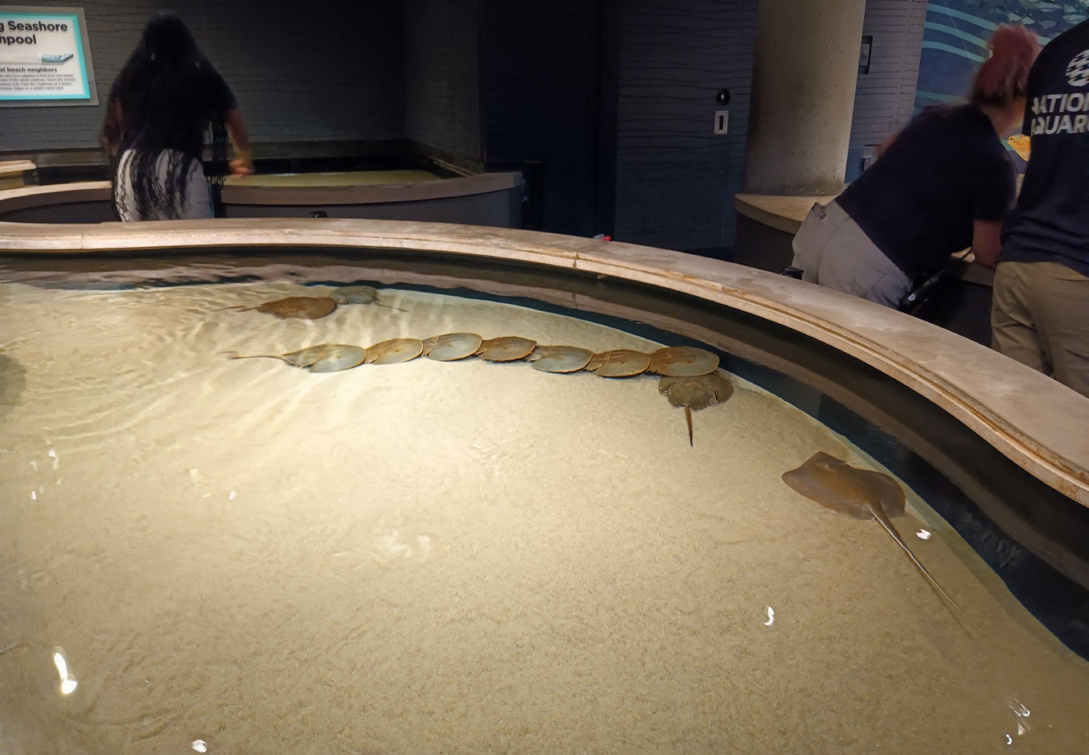 Upstairs, there was a touch pool. There were horseshoe crabs and small cute stingrays. Unfortunately, a small child scared the two stingrays away from the touch area, so I could not pet the stingrays, which was honestly massively disappointing. The horshoe crabs were quite cool though. They kept forming little lines and laying on top of each other.