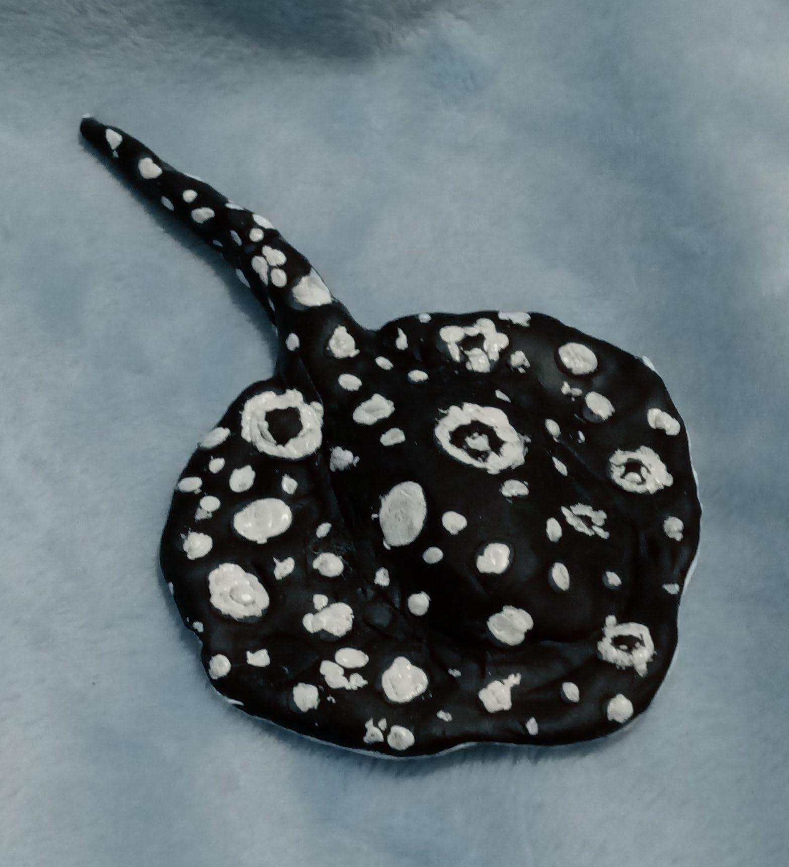 You can see on all the art pieces I did of the White Blotched River Stingray, I tried to mimic the patterns on the Baltimore stingray, especially the one spot on its left side that is a white ring with a white spot in the middle.
