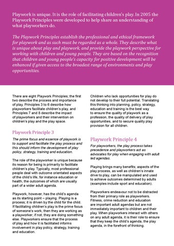 There are eight Playwork Principles; the first two describe the process and importance of play, Principles 3 to 6 describe how playworkers facilitate children’s play, and Principles 7 and 8 describe the impact of playworkers and their intervention on children’s play and the play space.