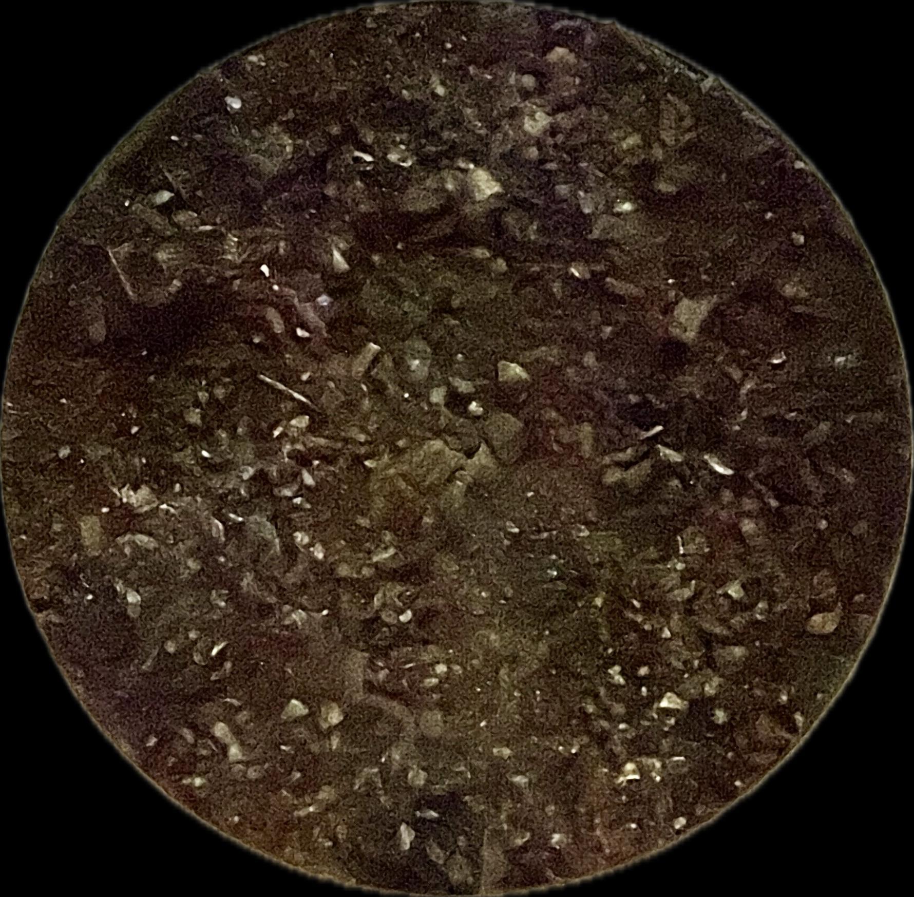 Ash, crushed red roof tile, dried lavender, pouring medium, fixative on round birch panel with a rough aluminum edge 36”x1.5”