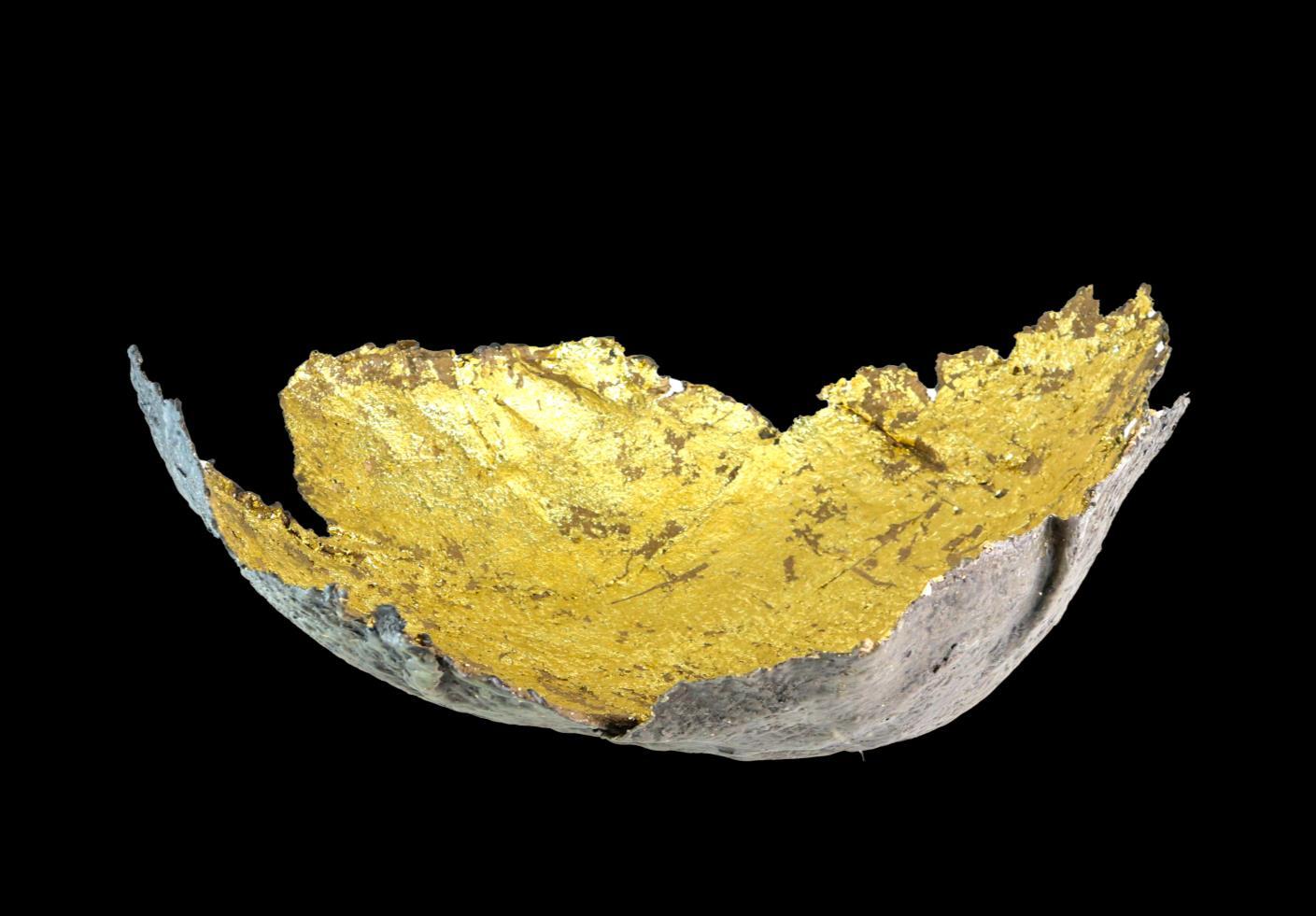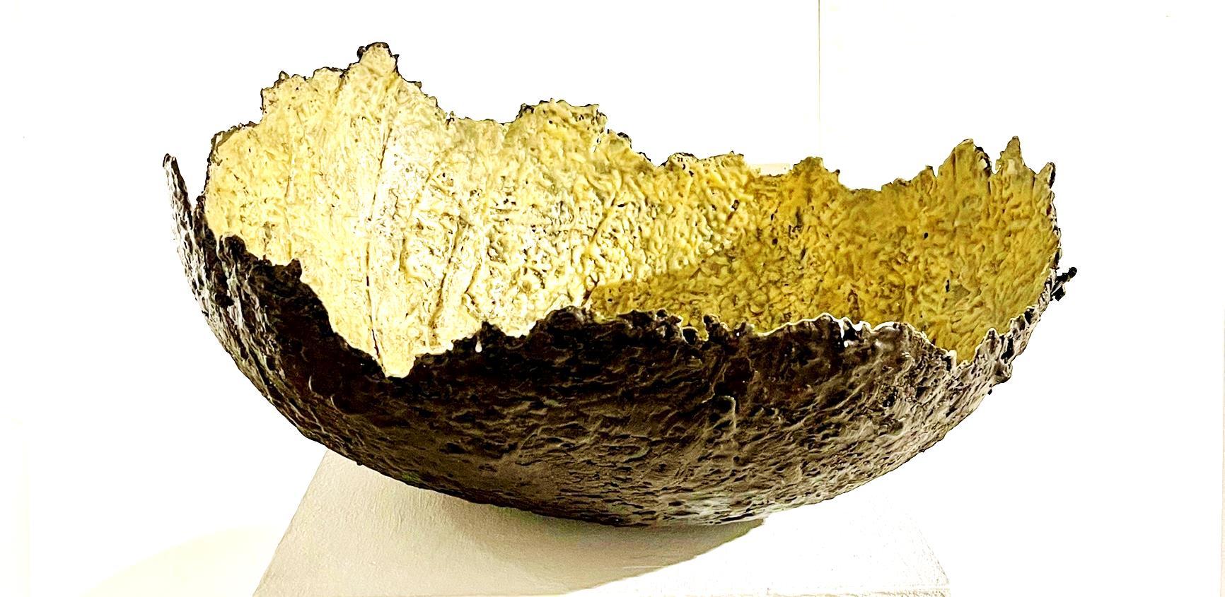 This fragile bowl comprised of building ash, beeswax, and damar varnish over a cast recycled paper form, tinted with scarlet oil and rubbed with gold leaf, speaks to me of the fragility of redemption in our lives, and the beauty of the Glory of God that is released in each of us.