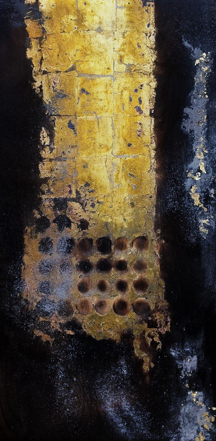 Fire, Ash, Gold Leaf on Wood Panel