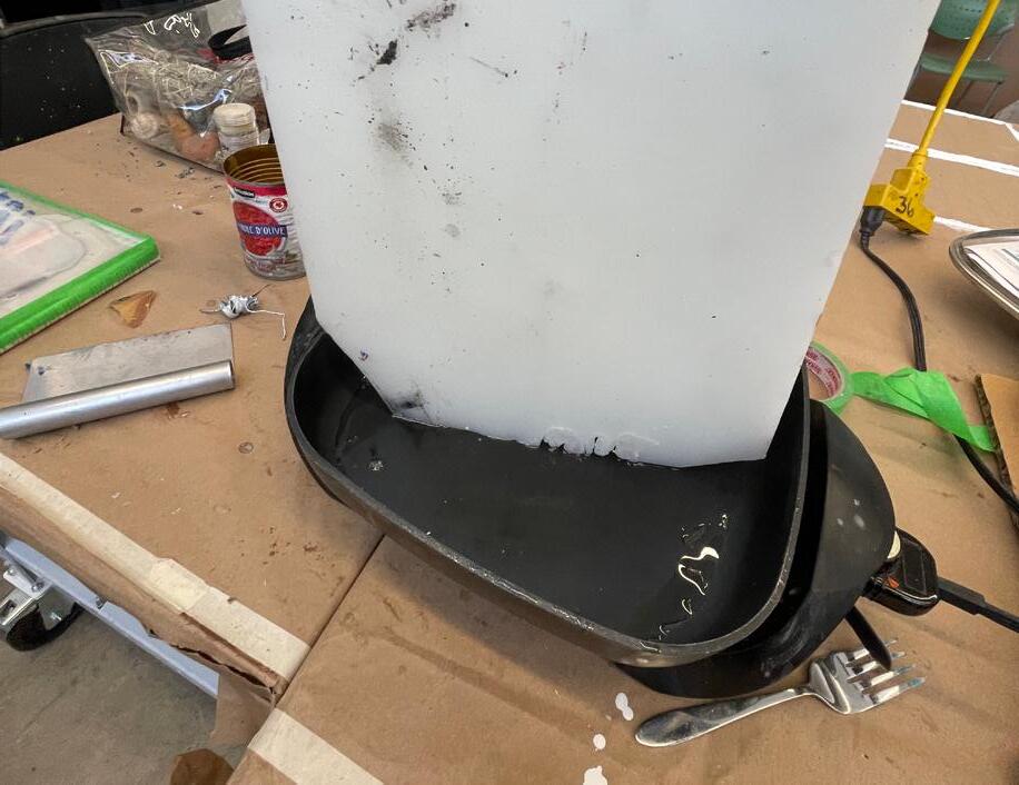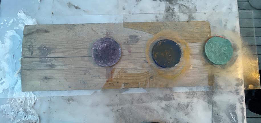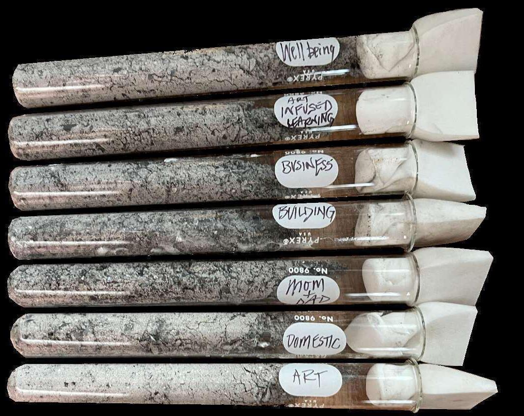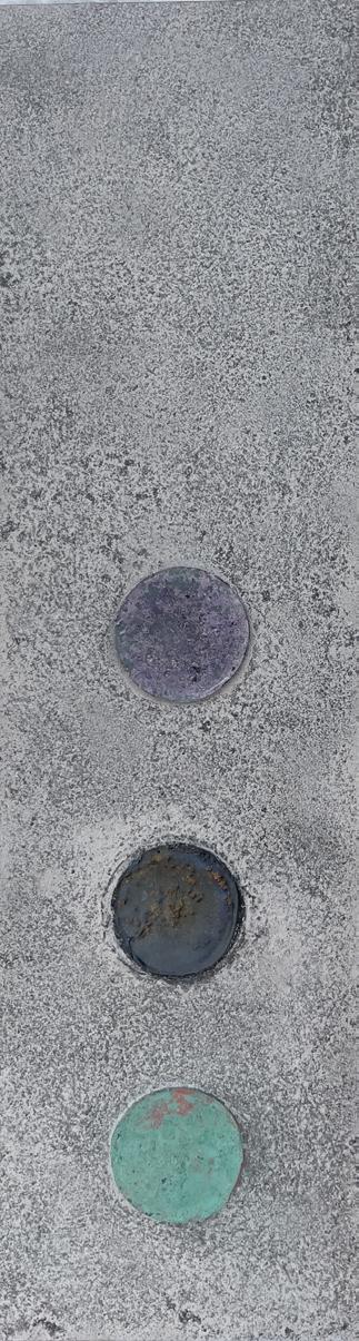 This work explores Terra Ferma through the fire, ash, grinding, stabilizers, and finished artworks amidst both historical figures and blessings of time past. Working with Lexan as the substrate, pouring medium, rigid tubing, and non-aerosol fixatives, we assemble time past in time present through encaustic and powdered pigments using moulds and a heat gun. Like life, we are reshaped through living and circumstances, landing in beauty. The pouring medium held its edge until disturbed by the ash’s weight when it needed a new boundary. The heat gun worked with encaustic and powdered pigments, yet the heat reshaped its final boundary. Humans also re ect a transformative journey to renewed beauty amidst a few boundary resets along the way.